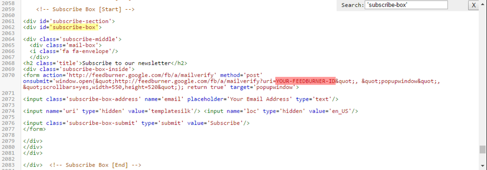 2 Click inside the HTML Box & press CTRL+F (For Calling Hidden Search Box) then search 'subscribe-box' & replace the YOUR-FEEDBURNER-ID with your blog FEEDBURNER ID as shown in below image.