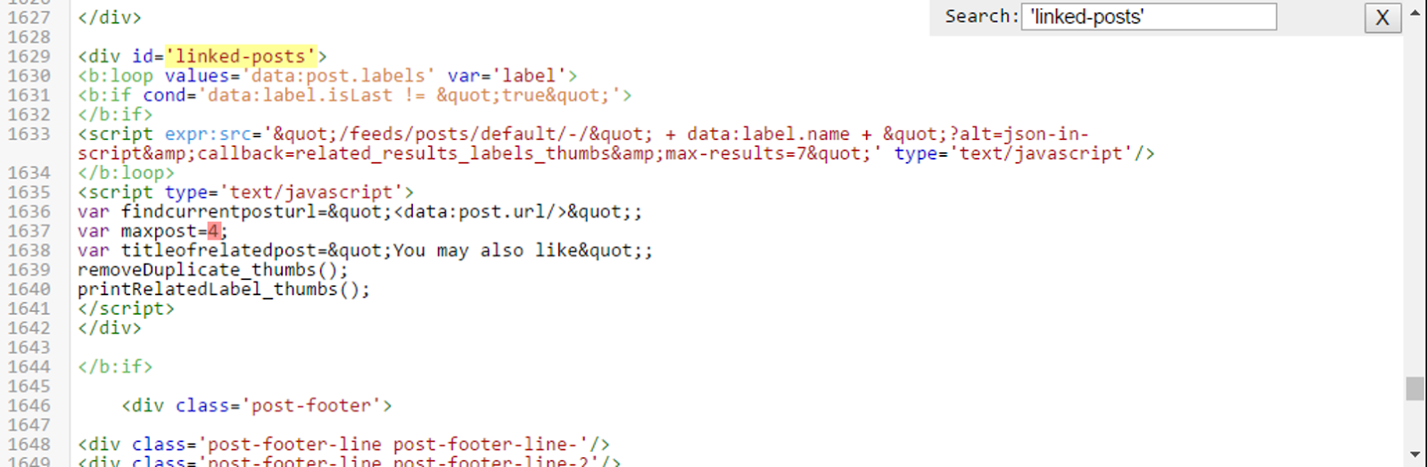 2 Click inside the HTML Box & press CTRL+F (For Calling Hidden Search Box) then search 'linked-posts' & replace the 4 with any other number. as shown in below image.