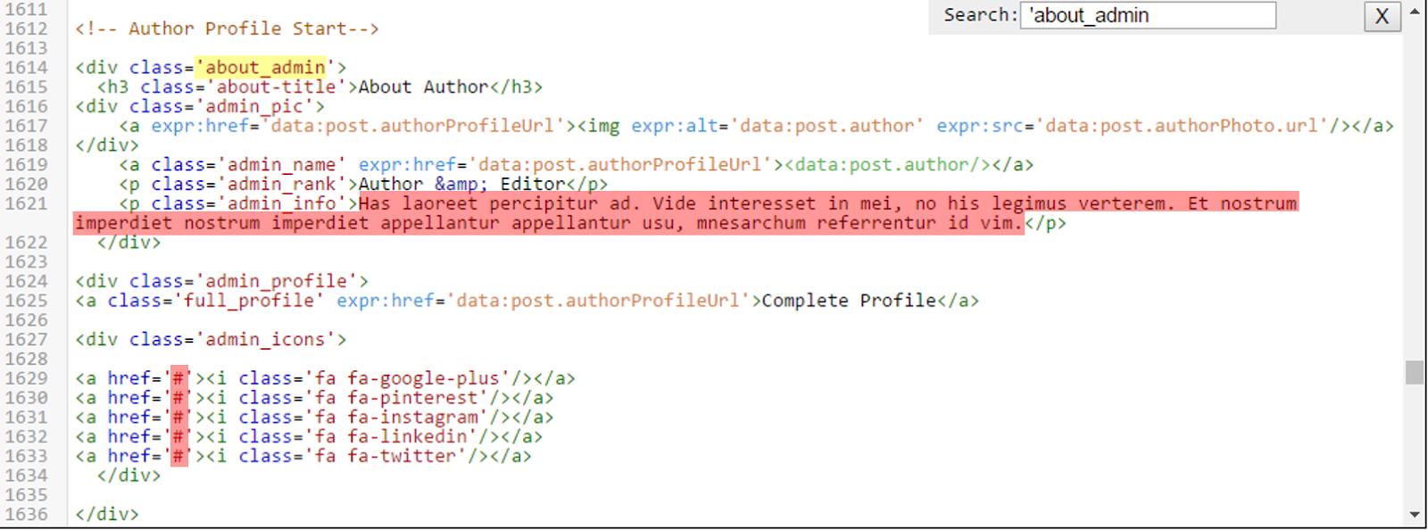 2 Click inside the HTML Box and press CTRL+F then search 'about_admin' & replace the # with your social pages link.