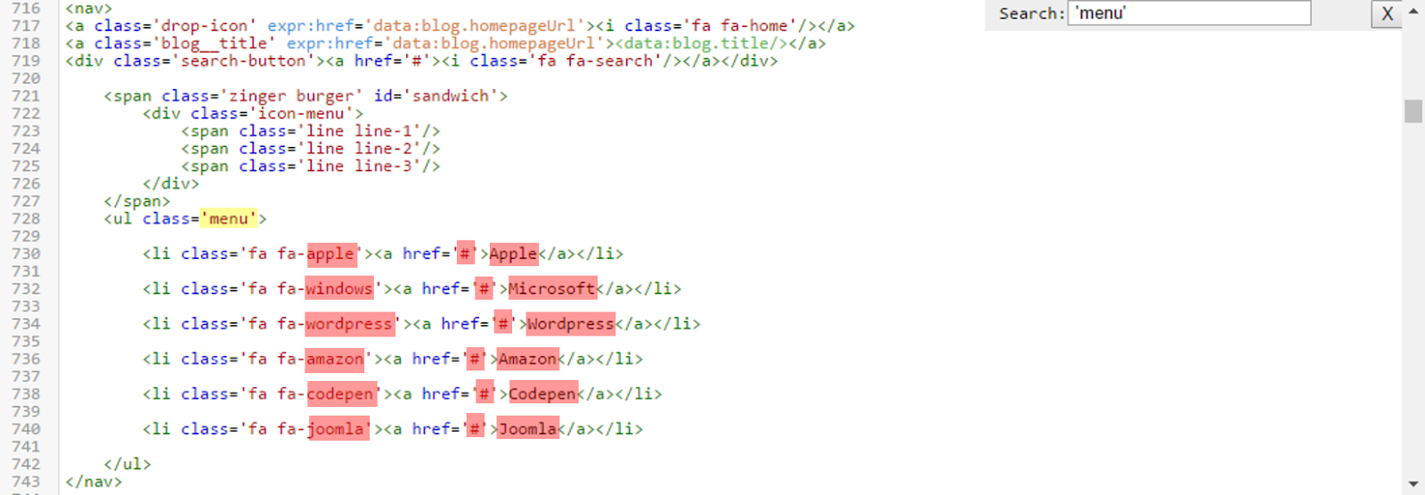 2 Click inside the HTML Box at once for focus and press CTRL+F (For Calling Hidden Search Box) then search 'menu' and replace the # with your link and Text in Red color with your Menu text name.