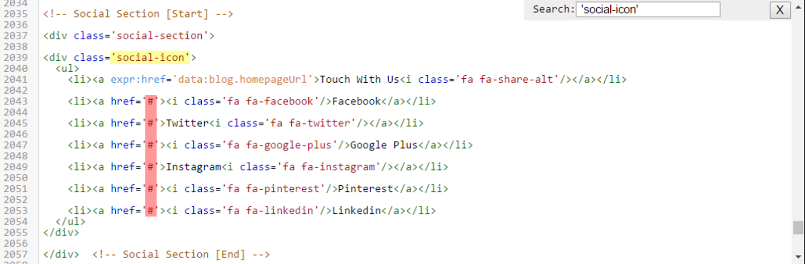 2 Click inside the HTML Box and press CTRL+F then search 'social-icon' & replace the # with your social pages link.