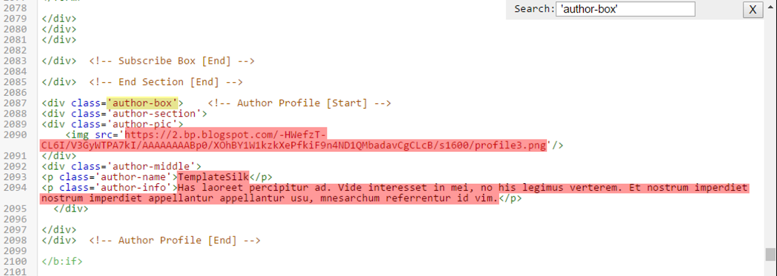 2 Click inside the HTML Box and press CTRL+F then search 'author-box' & and replace the image URL with yours, & change the text TemplateSilk with your Blog name.